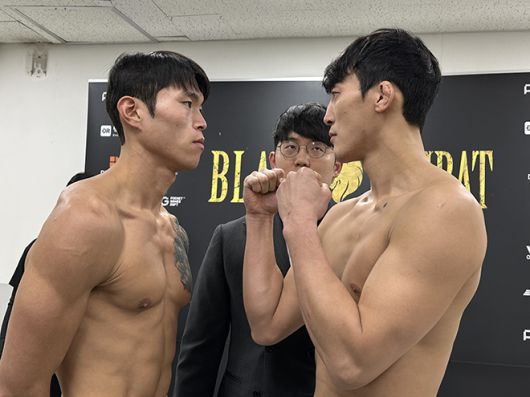 웰터급 3위 최준서(왼쪽), 같은 체급 2위 진태호(오른쪽)가 블랙컴뱃 13 제6경기 계체 통과 후 마주 보고 있다. 사진=이데아 파라곤 |