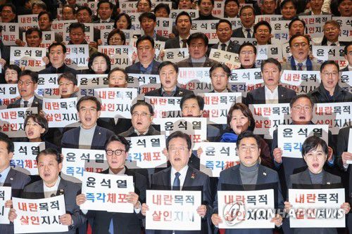 (서울=연합뉴스) 계승현 기자 = 더불어민주당은 27일 윤석열 대통령이 비상계엄 당시 직접 일선 지휘관들에게 "총을 쏴서라도 (국회) 문을 부수고 들어가서 끌어내라"라고 지시했다는 검찰 수사 결과가 나오자 "내란 수괴를 하루속히 체포해야 한다"며 격앙된 반응을 쏟아냈다.