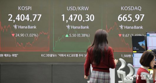 코스피가 전 거래일(2429.67)보다 24.90포인트(1.02%) 하락한 2404.77에 장을 마감한 27일 오후 서울 중구 하나은행 딜링룸 전광판에 지수가 표시 되고 있다. 송은석 기자 silverstone@donga.com |