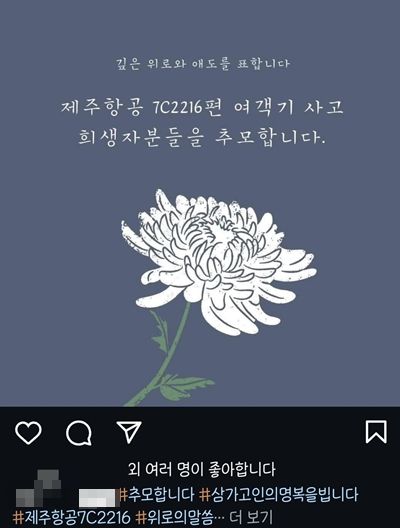 온라인 커뮤니티와 소셜네트워크서비스(SNS)에는 흰색 국화꽃 일러스트와 함께 ‘깊은 위로와 애도를 표합니다. 제주항공 7C2216편 여객기 사고 희생자분들을 추모합니다’라는 문장의 글귀가 실린 이미지가 다수 올라왔다. 누리꾼들은 이 같은 이미지를 올리며 “한순간에 소중한 가족을 잃게 된 유가족분들에게 위로의 말씀을 드린다” “삼가 고인의 명복을 빈다” 등 애도하는 글을 남겼다.