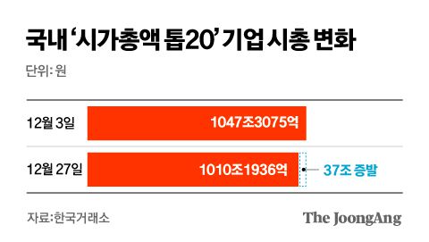29일 중앙일보가 한국거래소 데이터를 활용해 비상계엄이 선포됐던 지난 3일부터 최근인 27일까지 국내 시총 ‘톱 20위’ 기업의 시총을 분석해 보니 24일 만에 37조1139억원이 감소했다. 시총은 주가와 발행 주식수를 곱한 수치로, 기업 가치를 평가하는 대표적인 지표다.
