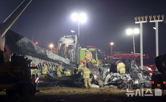 [무안=뉴시스] 김선웅 기자 = 29일 전남 무안국제공항에서 발생한 태국발 제주항공 여객기 충돌 폭발 사고 현장에서 소방대원들이 야간 수색 작업을 진행하고 있다. 2024.12.29. mangusta@newsis.com |