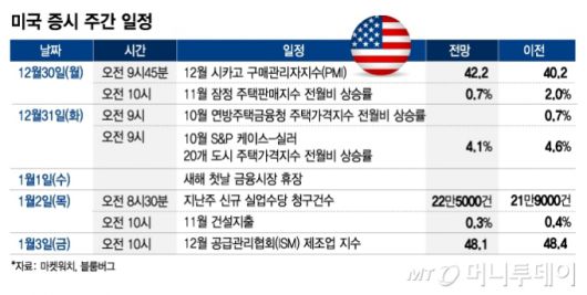 내년 1월1일은 새해 첫날 공휴일로 금융시장이 휴장한다. 2일에는 신규 주간 실업수당 청구건수가, 3일에는 12월 공급관리협회(ISM) 제조업 지수가 공개된다. 이 가운데 신규 실업수당 청구건수와 ISM 제조업 지수가 그나마 시장 영향력이 있는 경제지표다.