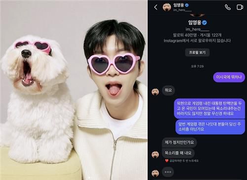 임영웅 반려견 생일축하 사진(왼쪽)과 이에 화난 누리꾼과의 대화록 |