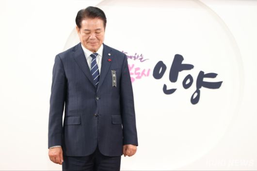 최대호 안양시장이 30일 공식 일정에 앞서 전날 발생한 제주항공 여객기 참사와 관련해 희생자들의 명복을 비는 묵념을 하고 있다. |