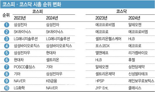 [이데일리 원다연 기자] 올 한해 국내 증시가 글로벌 증시에서 소외되며 하락세를 보인 가운데 코스피·코스닥 시장의 시가총액(시총) 순위도 요동쳤다. ‘밸류업’ 정책과 금리 인하 기대에 금융주와 바이오주가 주도주로 떠오른 가운데 2차전지주는 부진이 이어지며 순위권 밖으로 밀려났다.