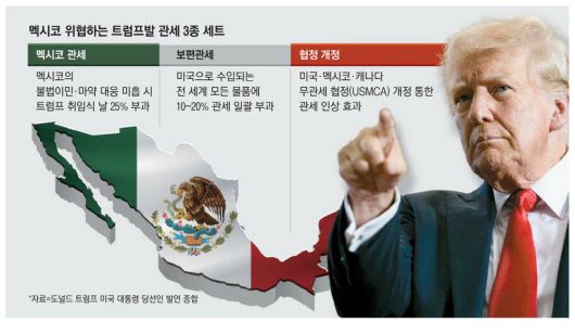 2018년 북미자유무역협정(NAFTA)이 USMCA로 대체된 이후 미국의 대멕시코 무역적자가 눈덩이처럼 불어나 트럼프 당선인이 개정을 잔뜩 벼르고 있기 때문이다. 멕시코는 지난해 중국을 제치고 처음으로 미국의 최대 수입국이 되기도 했다.