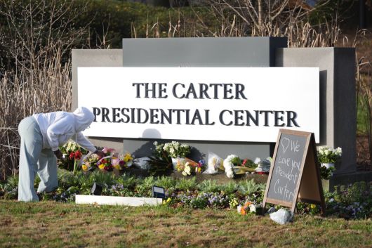 30일(현지 시간) 미 조지아주 애틀랜타에 있는 ‘카터센터’ 입구에 추모객이 헌화하고 있다. 애틀랜타=AP 뉴시스 |