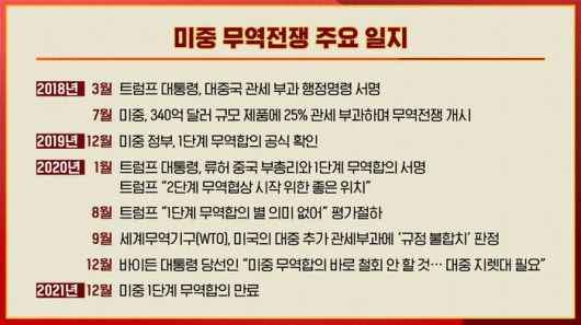 2019년 트럼프와 시진핑의 1단계 무역 합의에서 중국은 2,000억 달러의 무역 흑자를 줄이는 수입 확대를 약속했지만 중국은 트럼프의 낙마와 코로나를 핑계로 약속한 금액의 57% 선에서 수입을 중단했다.