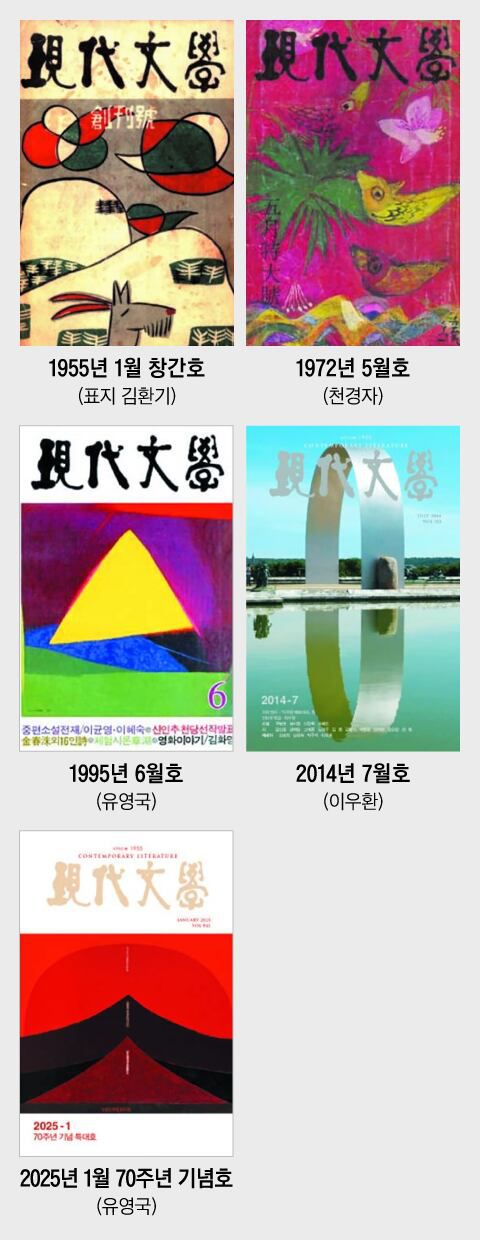 한국 최장수 문예지 ‘현대문학’은 창간 70주년을 맞아 이를 기념하는 특대(特大)호를 1일 출간했다. 1955년 1월 창간 이후 단 한 번의 결호도 없었다. 이번이 841호. 한국 추상미술의 선구자 유영국(1916~2002)의 그림 두 점을 표지화로 정해 서로 다른 두 버전의 표지를 제작했다. 단편소설 10편, 시 20편, 중편소설 1편 등 총 456쪽에 달한다. 통상 단편소설 5편, 시 10편을 싣는데, 이번엔 분량을 대폭 늘렸다. 두툼하고 묵직하다.