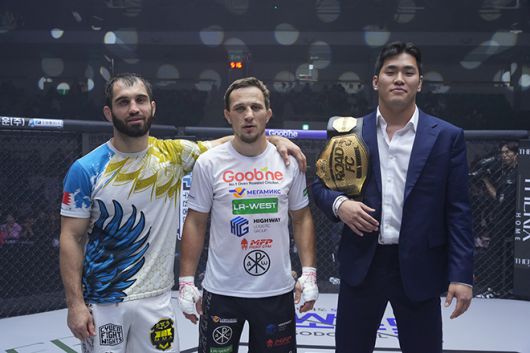 왼쪽부터 제2회 로드FC 글로벌 토너먼트 준결승 이후 카밀 마고메도프, 아르투르 솔로비예프, 박시원. 사진=세계격투스포츠협회 |