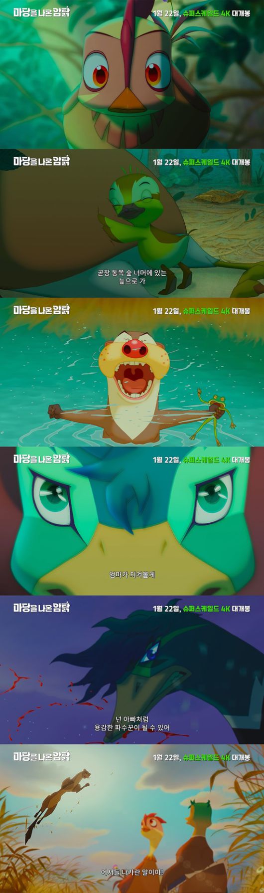 여기에 '더 넓은 세상을 향한 위대한 모험'이라는 카피는 슈퍼스케일드 4K 기술로 스크린 가득 펼쳐질 잎싹과 초록의 놀라운 도전을 기대케 한다.