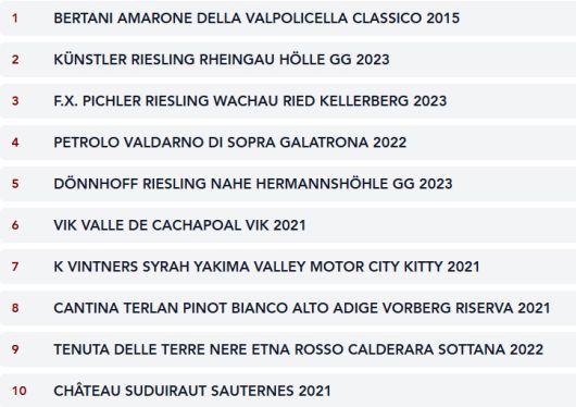 미국 와인으로는 보리우 빈야드의 '죠르쥬 드 라뚜르 프라이빗 리저브 카베르네 소비뇽 2021'(2위)과 '파우스트, 나파밸리 카베르네 소비뇽 2021'(4위), '침니 락, 스택스 립 카베르네 소비뇽 2021'(5위), '드루앵 오리건, 로즈락 에올라 힐즈 피노누아 2022'(6위), '윌리엄 셀럼, 러시안 리버밸리 이스트사이드 로드 네이버스 피노누아 2022'(8위), '라미, 러시안 리버 밸리 샤르도네 2022'(10위) 등이 꼽혔다. 죠르쥬 드 라뚜르 2019 빈티지는 제임스서클링이 지난 2022년 최고의 와인으로 꼽았을 정도로 꾸준히 좋은 평가를 받고 있다.