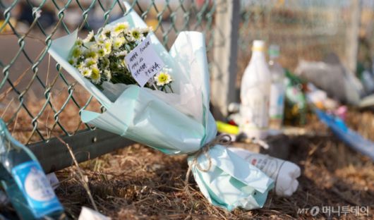 [무안=뉴시스] 김선웅 기자 = 2일 전남 무안국제공항 제주항공 여객기 참사 현장에 희생자들을 추모하는 꽃이 놓여 있다. 2025.01.02. mangusta@newsis.com /사진=김선웅 |