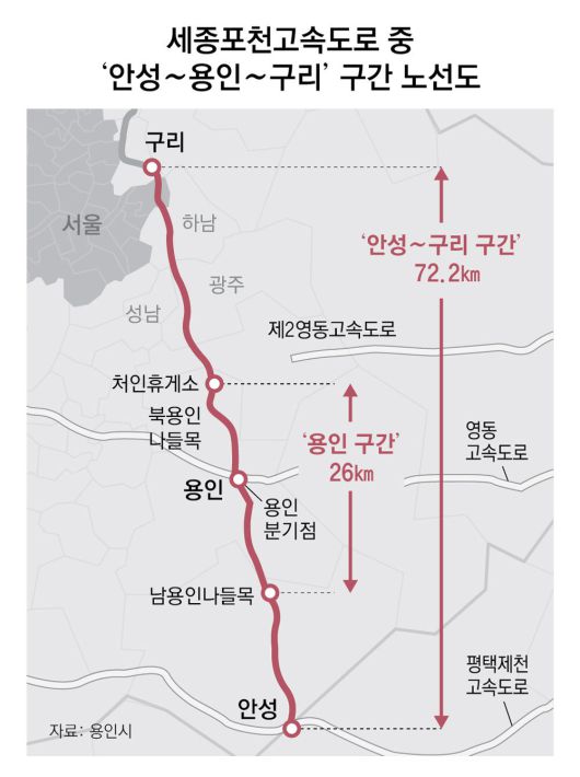 도로 개통으로 가장 큰 혜택을 보는 곳은 경기 용인이다. 경부고속도로 상습 정체가 완화되고 위례·동탄2 같은 신도시로 이동하는 편의성이 높아졌다. ‘구리∼포천’ 구간과 이어지고, 수도권제1순환선, 올림픽대로, 강변북로 등의 접근성도 좋아져 서울, 경기 북부로 가는 길이 수월해졌다. 평택∼제천고속도로와 연결돼 충청권 이동도 한결 나아졌다.