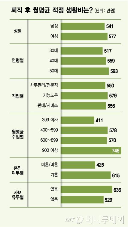 소득공백 기간 중 가정의 적정한 생활을 유지하기 위한 월평균 적정 생활비는 556만원으로 조사됐다. 남성(541만원)보다 여성(577만원)의 적정 생활비 눈높이가 더 높았다.