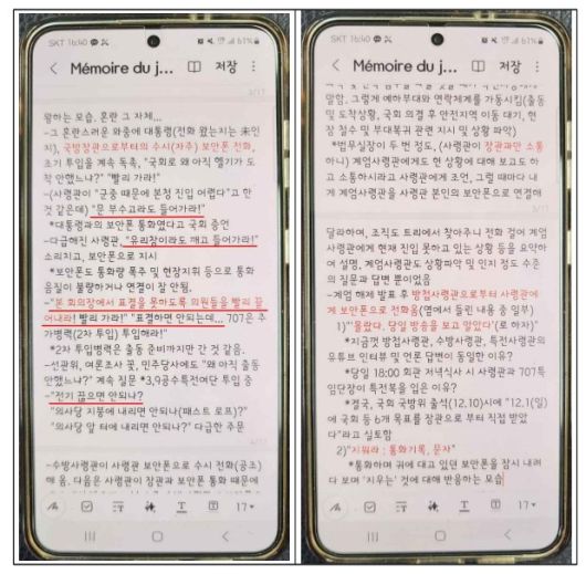 검찰은 '특전사 간부의 휴대폰' 메모도 공개했다. 이 메모에는 '그 혼란스러운 와중에 대통령(전화왔는지는 미인지), 국방장관으로부터의 수시 보안폰 전화, 조기 투입을 계속 독촉, "국회로 왜 아직 헬기가 도착 안 했느냐, 빨리 가라!"', '(사령관이 "군중 때문에 본청 진입 어렵다"고 한 것 같은데) "문 부수고라도 들어가라!"', '다급해진 사령관, "유리창이라도 깨고 들어가라!" 소리치고, 보안폰으로 지시' 등의 내용이 적혀있다.