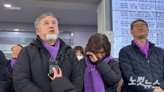 이종민 이태원참사 유가족협의회 운영위원장이 제주항공 참사 유족에게 위로의 말을 전하다 하늘을 응시하고 있고 다른 유족은 눈물을 훔치고 있다. 김수진 기자 |