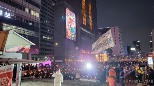 CJ택배 공동대책위원회와 민주노총 전국택배노동조합(택배노조)이 2022년 2월 서울 중구 청계광장에서 CJ대한통운에 사회적합의 이행을 촉구하는 촛불 집회를 연 모습. 강승연 기자 |