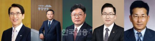 (왼쪽부터)신창재 교보생명 회장, 이문구 동양생명 대표, 김중현 메리츠화재 대표, 나채범 한화손보 대표, 송춘수 농협손보 대표 / 사진제공=각사 |