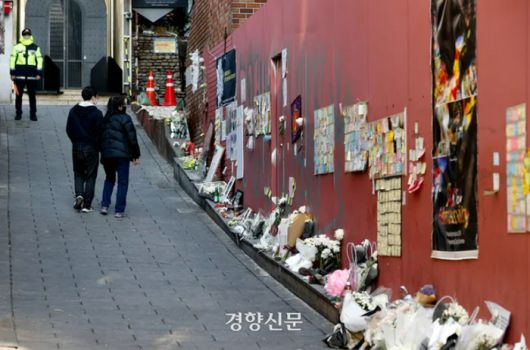 2022년 11월15일 ‘이태원 핼러윈 참사’ 현장에 마련된 추모공간에서 시민들이 희생자들을 추모하고 있다. 문재원 기자 |