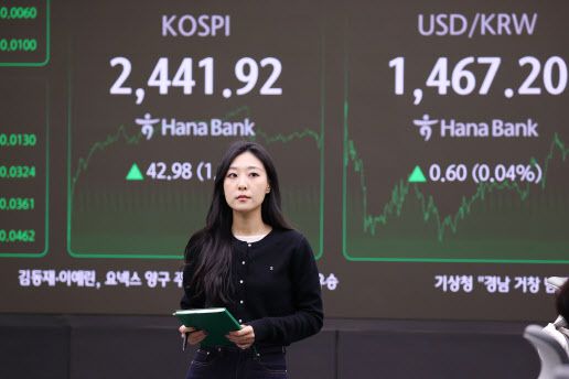 △코스피가 6거래일 만에 반등해 2440대를 회복한 지난 3일 오후 서울 중구 하나은행 본점 딜링룸 현황판에 코스피 지수 등이 표시되고 있다.(사진=연합뉴스) |