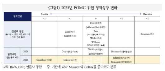 [이데일리 이정윤 기자] 올해 투표권을 가진 미국 연방공개시장위원회(FOMC) 위원 중 일부가 교체되면서 매파적(통화긴축 선호) 성향이 강화한 것으로 나타났다. 이와 함께 트럼프 2기 행정부 출범, 양호한 미국 경제 등으로 인해 올해 미 연방준비제도(Fed·연준)의 금리 인하 주기가 줄어들 것으로 전망된다.