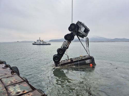 5일 충남 태안해양경찰에 따르면 이날 오후 1시 40분께 720t급 해상 크레인을 동원해 서산시 고파도 인근 해역에서 24t 덤프트럭을 인양하는 데 성공했다.