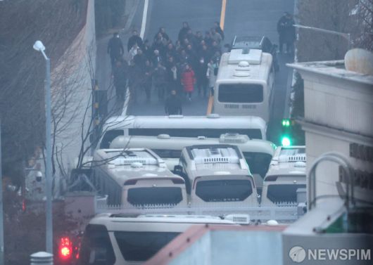 [서울=뉴스핌] 김학선 기자 = 윤석열 대통령 체포영장 시한인 6일 오전 서울 용산구 대통령 관저를 찾은 국민의힘 의원들이 이동하고 있다. 2025.01.06 yooksa@newspim.com