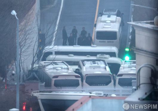 [서울=뉴스핌] 김학선 기자 = 윤석열 대통령 체포영장 시한인 6일 오전 서울 용산구 대통령 관저 출입구에 차벽이 설치되어 있다. 2025.01.06 yooksa@newspim.com