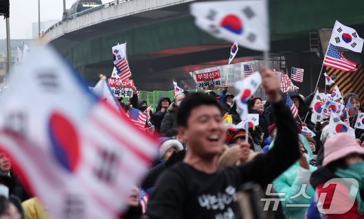 (서울=뉴스1) 김성진 기자 = 윤석열 대통령의 체포영장 유효기간 마지막 날인 6일 서울 용산구 한남동 대통령 관저 인근에서 윤석열 대통령 지지자들이 '공수처의 체포영장 집행 관련 경찰 일임 기사'를 접한 후 환호하고 있다. 2025.1.6/뉴스1ssaji@news1.krCopyright ⓒ 뉴스1. All rights reserved. 무단 전재 및 재배포, AI학습 이용 금지.