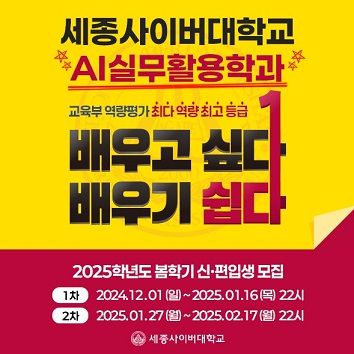 세종사이버대학교 AI실무활용학과는 오는 1월 16일까지 2025학년도 봄학기 1차 신·편입생을 모집하고 있다.