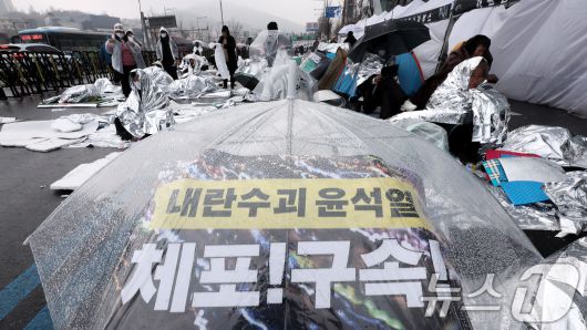(서울=뉴스1) 김성진 기자 = 윤석열 대통령의 체포영장 유효기간 마지막 날인 6일 서울 용산구 한남동 대통령 관저 앞 한남대로에서 '윤석열 즉각 퇴진·사회 대개혁 비상행동' 참가자들이 철야투쟁을 이어가고 있다. 2025.1.6/뉴스1