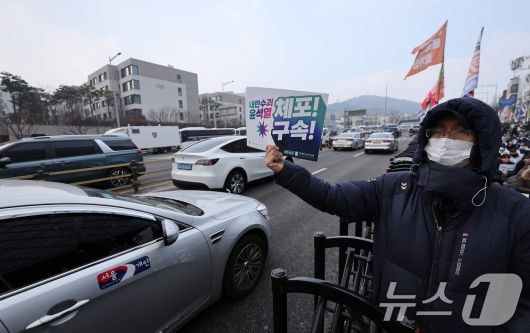 (서울=뉴스1) 김성진 기자 = 윤석열 대통령의 체포영장 유효기간 마지막 날인 6일 서울 용산구 한남동 대통령 관저 인근에서 열린 '윤석열 체포 구속 긴급행동'에서 민주노총, 진보당 등 진보단체를 비롯한 시민들이 윤석열 대통령 체포 및 구속을 촉구하며 손피켓을 들고 있다. 2025.1.6/뉴스1