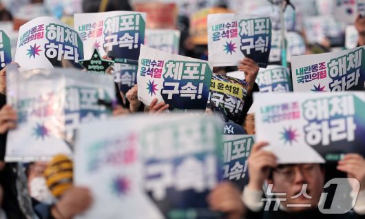 (서울=뉴스1) 김성진 기자 = 윤석열 대통령의 체포영장 유효기간 마지막 날인 6일 서울 용산구 한남동 대통령 관저 인근에서 열린 '윤석열 체포 구속 긴급행동'에서 민주노총, 진보당 등 진보단체를 비롯한 시민들이 윤석열 대통령 체포 및 구속을 촉구하며 손피켓을 들고 있다. 2025.1.6/뉴스1