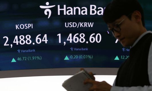 6일 오후 서울 중구 하나은행 본점 딜링룸 현황판에 코스피 지수 등이 표시되고 있다. (사진=연합뉴스) |