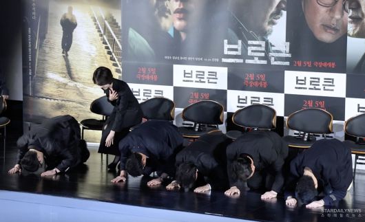 [스타데일리뉴스=진이주기자] 배우 하정우, 김진황 감독, 김남길, 유다인, 임성재, 정만식식(사진 왼쪽부터)이 6일 서울 자양동 건대입구 롯데시네마에서 진행된 영화 '브로큰' 제작보고회에 참석해 포즈를 취했다.