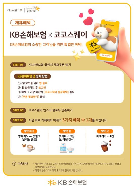 양사는 이번 협업을 통해 KB손해보험 애플리케이션 이벤트 페이지에서 코코스퀘어 쿠폰을 다운로드 후, 코코스퀘어 매장 방문 시 아메리카노, 반려견 아이스크림, 펫 밀크 등을 무료로 제공하는 이벤트를 진행한다.