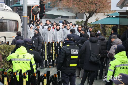 지난 6일 서울 용산구 한남동 대통령실 관저 입구 앞에 국민의힘 의원들이 만약에 있을 체포영장 집행에 대비해 대기하고 있다. 성동훈 기자 |
