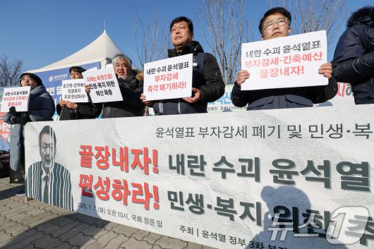 (서울=뉴스1) 민경석 기자 = 참여연대 조세재정개혁센터 등 시민사회단체 관계자들이 7일 오전 서울 영등포구 여의도 국회의사당 앞에서 '윤석열표 부자감세 폐기 및 민생·복지 추경 촉구 기자회견'을 하고 있다. 이날 참가자들은 "3년 연속 대규모 세수결손 우려 속에 내수 활성화와 취약계층 지원을 위한 재정여력을 축소시킬 뿐인 윤석열표 부자감세는 즉각 철회돼야 마땅하다"고 주장했다. 2025.1.7/뉴스1