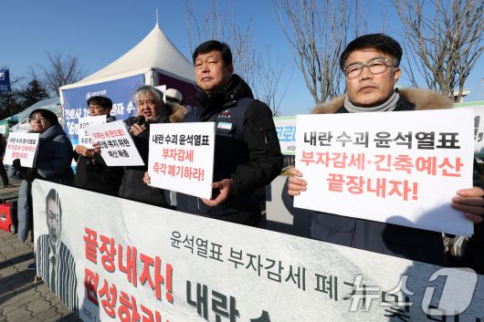 (서울=뉴스1) 민경석 기자 = 참여연대 조세재정개혁센터 등 시민사회단체 관계자들이 7일 오전 서울 영등포구 여의도 국회의사당 앞에서 '윤석열표 부자감세 폐기 및 민생·복지 추경 촉구 기자회견'을 하고 있다. 이날 참가자들은 "3년 연속 대규모 세수결손 우려 속에 내수 활성화와 취약계층 지원을 위한 재정여력을 축소시킬 뿐인 윤석열표 부자감세는 즉각 철회돼야 마땅하다"고 주장했다. 2025.1.7/뉴스1