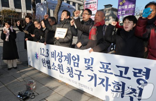 (서울=뉴스1) 송원영 기자 = 윤석열즉각퇴진·사회대개혁비상행동 회원들이 7일 서울 종로구 헌법재판소 앞에서 열린 '12.3 비상계엄 및 포고령 헌법소원 청구 기자회견'에서 구호를 외치고 있다. 2025.1.7/뉴스1sowon@news1.krCopyright ⓒ 뉴스1. All rights reserved. 무단 전재 및 재배포, AI학습 이용 금지.