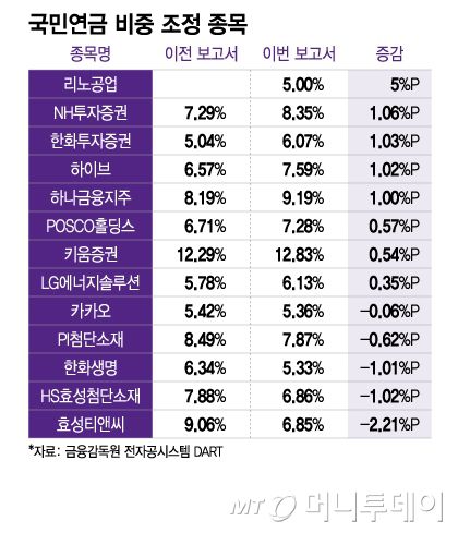 국민연금 비중 조정 종목/그래픽=이지혜 |