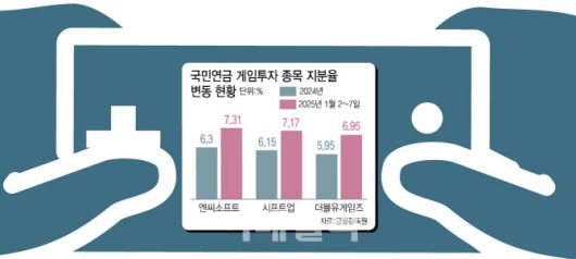 지난해 경기 침체 우려 속 미국 도널드 트럼프 2기 행정부 출범에 따른 관세 부과 가능성 등으로 국내 증시의 낙폭이 심화하자 저평가된 종목 위주로 매수에 나선 것으로 보인다. 게임주가 대표적이다. 국민연금은 엔씨소프트(036570)의 보유 비중을 6.3%에서 7.31%로 1.01%포인트 상향했다. 더블유게임즈(192080)와 시프트업(462870)도 각각 1%포인트 이상 지분율을 늘렸다.