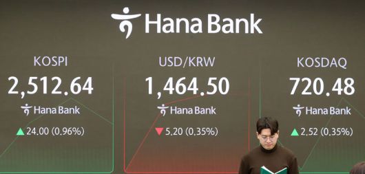 7일 오전 서울 중구 하나은행 딜링룸 전광판에 지수가 표시돼 있다. 외국인 투자가들의 매수세가 이어지며 코스피는 이날 장중 2,500 선을 회복하기도 했다. 뉴시스 |