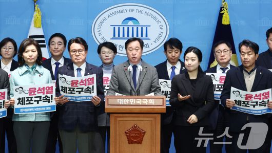 (서울=뉴스1) 김민지 기자 = 윤석열탄핵국회의원연대 소속 더불어민주당, 조국혁신당, 진보당 의원들이 8일 오전 서울 여의도 국회 소통관에서 윤석열 대통령 즉각 체포 촉구 기자회견을 하고 있다. 2024.1.8/뉴스1kimkim@news1.krCopyright ⓒ 뉴스1. All rights reserved. 무단 전재 및 재배포, AI학습 이용 금지.