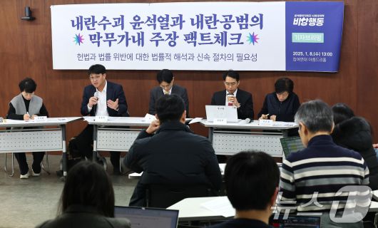(서울=뉴스1) 임세영 기자 = 유승익 한동대 연구교수·참여연대 사법감시센터 부소장(왼쪽 두번째)이 8일 오후 서울 종로구 통인동 참여연대 아름드리홀에서 열린 내란수괴 윤석열과 내란공범의 막무가내 주장 팩트체크 기자브리핑에서 발언을 하고 있다. 2025.1.8/뉴스1