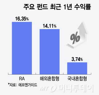 금융정보업체 에프앤가이드 데이터를 보면 지난 7일을 기준으로 1년간 RA 펀드 운용 수익률은 16.35%다. 같은 기간 펀드매니저들이 운용하는 해외혼합형 펀드 1년 수익률은 14.11%였다. 2%P(포인트) 이상 RA 수익률이 높았다.