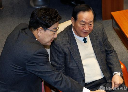 [서울=뉴스핌] 윤창빈 기자 = 권성동 국민의힘 원내대표, 한기호 의원이 8일 오후 서울 여의도 국회에서 열린 본회의에서 대화를 나누고 있다. 2025.01.08 pangbin@newspim.com
