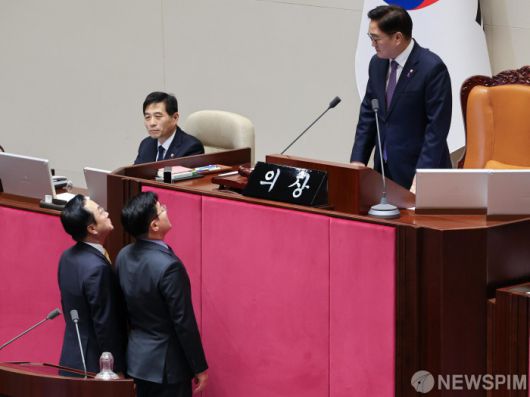 [서울=뉴스핌] 윤창빈 기자 = 박찬대 더불어민주당 원내대표, 박성준 원내수석부대표가 8일 오후 서울 여의도 국회에서 열린 본회의에서 쌍특검법 등 재의된 8개 법안이 모두 부결되자 우원식 국회의장과 대화하고 있다. 2025.01.08 pangbin@newspim.com